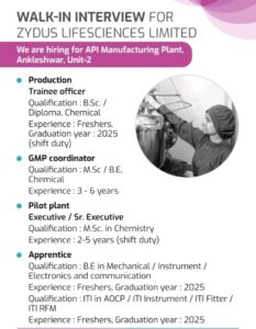 Zydus Walk-In Interview 2025 : Join a reputed Injectable Manufacturing Plant in Vadodara! Walk-in interview on 14th September 2025 for QA, QC, Production, Engineering, and Microbiology roles. Explore …