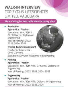 Zydus Lifescience Walk In Interview 2025 For Production, Packing and Engineering Dept at Vadodara Location. 1. Vacancy Details in Zydus Lifescience Walk In Interview 2025 2. Interview Schedule …