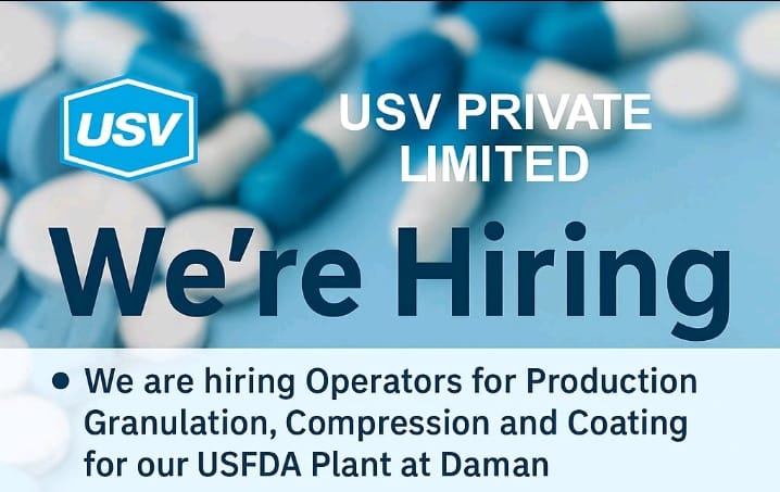 USV Private Limited Latest Opening 2025 hiring Operators for Production Granulation, Compression and Coating for our USFDA Plant at Daman Location.