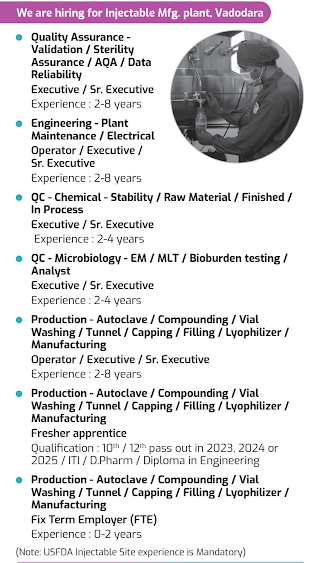 1. Job Openings – Injectable Manufacturing Plant, Vadodara